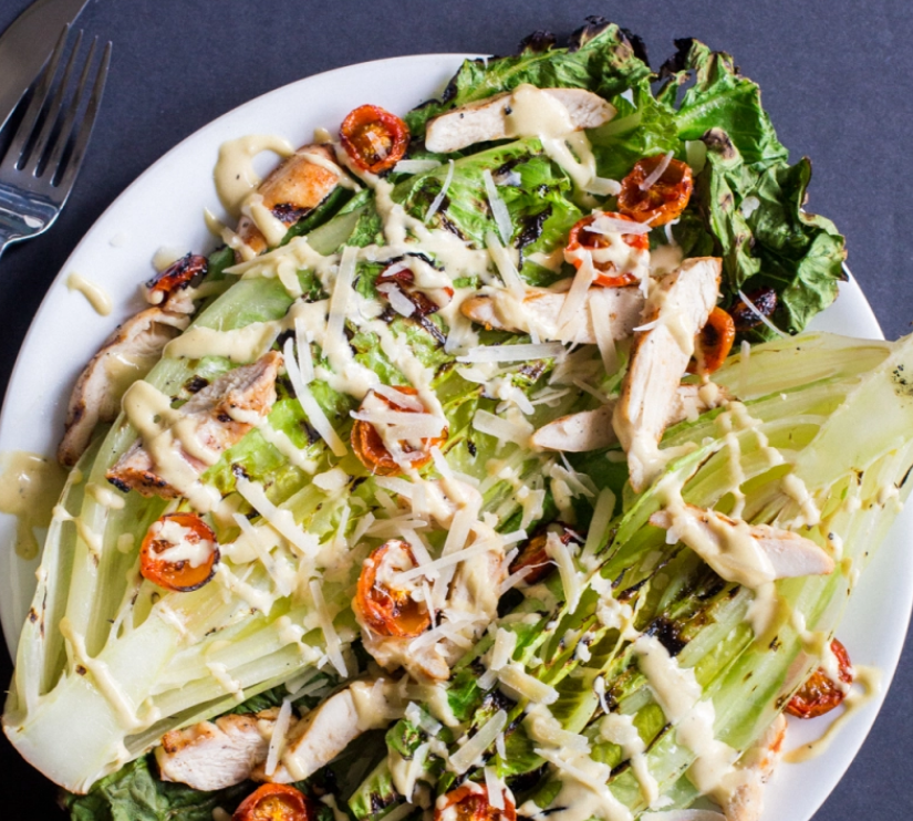 로메인레터스, 크루통, 파마산 치즈, 구운 닭고기(선택 사항)를 모두 시저 드레싱에 버무립니다.